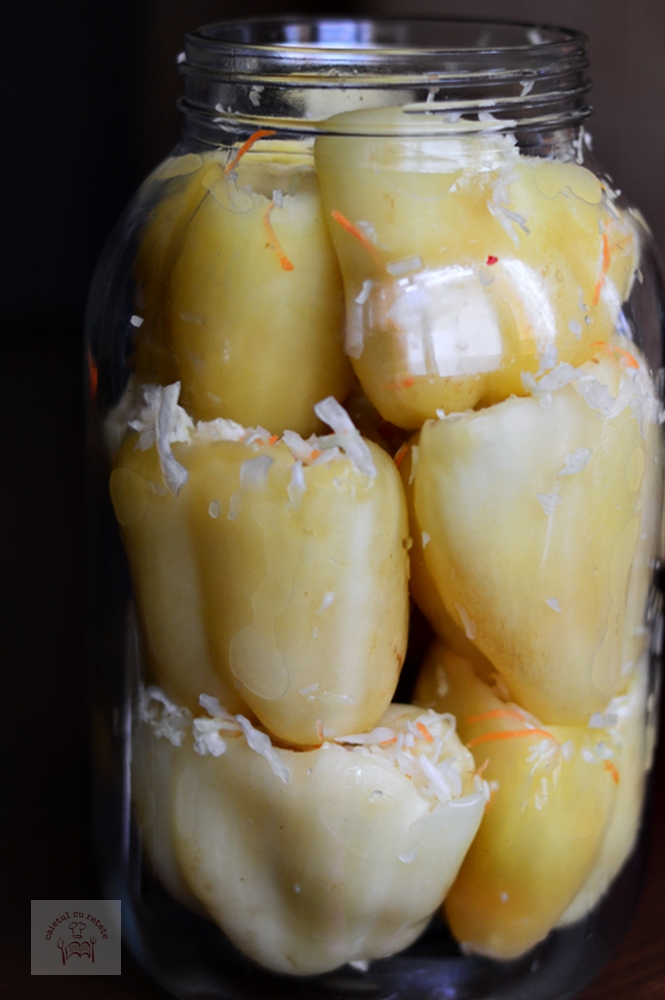 A doua zi le am pus cate 1 2 linguri de otet alimentar si le am inchis bine si etans cu capacele din dotare. Ardei umpluti cu varza. 1 kg de ardei 1 varza 2 kg sare pentru muraturi neiodata cimbru si marar uscate 2 radacini hrean 2 3 foi de dafin piper boabe apa. Ardeii se umplu cu amestecul de varză şi legume şi se pun într un vas pentru măcerare acrire la loc răcoros dar nu în frigider.
