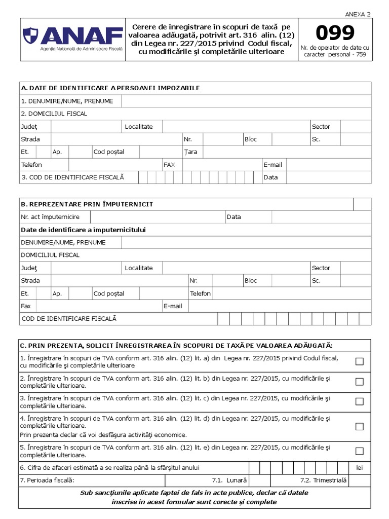316 înregistrarea persoanelor impozabile în scopuri de tva 1 persoana impozabilă care are sediul activităţii economice în românia şi realizează sau intenţionează să realizeze o activitate economică ce implică operaţiuni taxabile scutite de taxa pe valoarea adăugată cu drept de deducere şi sau operaţiuni rezultate din activităţi economice pentru care locul. 227 2015 privind codul fiscal. 3 din legea nr. 2 anularea înregistrării în scopuri de tva a unei persoane nu o exonerează de.