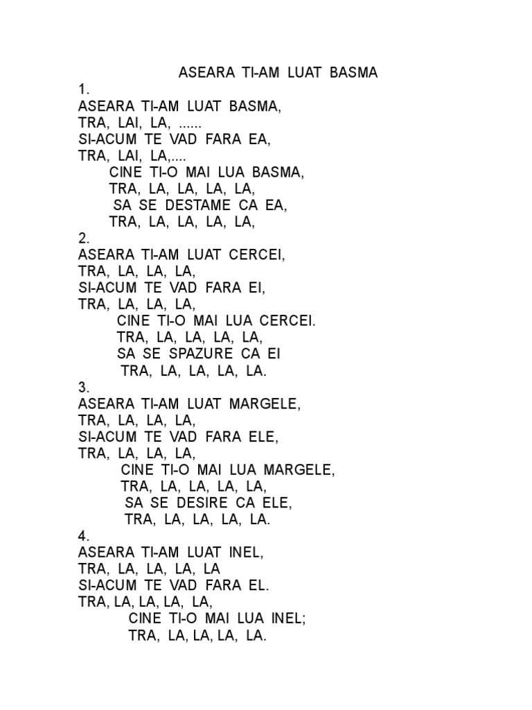 This entry was posted in maria tănase and tagged cantece populare folclor lyrics tanase ti am luat basma versuri. Pre refren hai spune tu draga marie cu cine ai fost aseara in vie nu ti ajunge un singur barbat ce pacat ca refren aseara ti am luat basma si acum te vad fara ea cine ti o mai lua basma sa se destrame ca ea. Aseara ti am luat basma si ai plecat la club cu ea azi esti femeie cand ieri imi erai fata o fi basmaua fermecata. Cine i saruta face coaja.