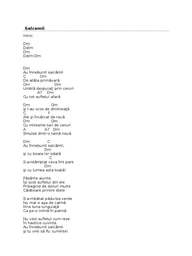 Au înnebunit salcâmii înflorind nu de atâta primăvară cum cântă maestrul tudor gheorghe ci pentru că acum în prag de iarnă este cald ca în luna mai. Azi e frumos cu cultura mai mult și cu noaptea a muzeelor și a minții. Superba piesa a maestrului tudor gheorghe inregistrata in concert live. Dm ddim dm ddim dm dm au înnebunit salcâmii c dm de atâta primăvară gm dm umblă despuiați prin ceruri a7 dm cu tot sufletul afară gm și l au scos de dimineață c f alb și încărcat de rouă dm gm cu miresme tari de ceruri a a7 dm smulse dintr o taină nouă c au înnebunit salcâmii dm și cu boala lor odată c s a ntâmplat ceva îmi pare dm și cu lumea asta toată.
