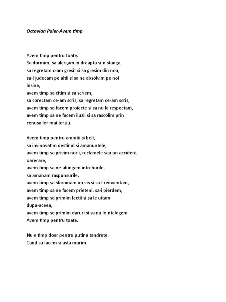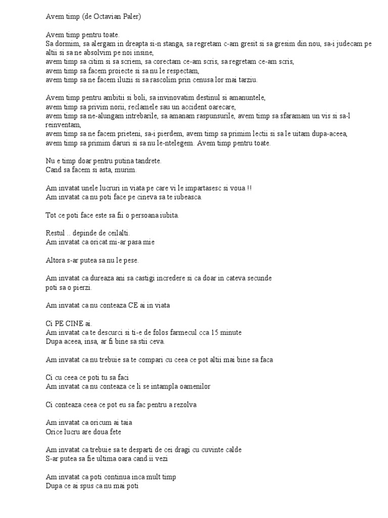 Avem timp pentru toate. Sa dormim sa alergam in dreapta si n stanga sa regretam c am gresit si sa gresim din nou sa i judecam pe altii si sa ne absolvim pe noi insine avem timp sa citim si sa scriem sa corectam ce am scris sa regretam ce am scris avem timp sa facem proiecte si sa nu. Avem timp pentru toate. Avem timp pentru toate.